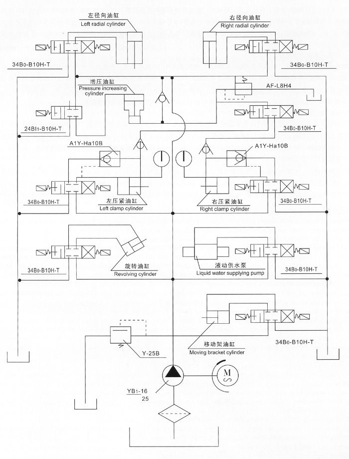 本機結構大致可分為液壓系統、電器控制系統、左右工作臺活動夾爪和液動供壓裝置及介質循環系統等部件組成。右邊工作臺設有夾緊機構和 90度翻轉機構,夾緊機構由夾爪的夾緊裝置和徑向移動裝置組成,夾爪的夾緊裝置是采用各油缸直接驅動來實現,使各爪受力均勻,夾緊可靠。夾爪的徑向移動裝置是采用杠桿式結構,實現了各爪徑向同步移動。左邊工作臺可自動進退。并具有性能好,結構簡單緊湊等特點。液壓電器控制系統 (詳見液壓和電器原理圖)安裝在底層固定架內,是測試臺的控制部分,在與電器聯合控制下使各機構能協調動作,滿足測試程序要求。